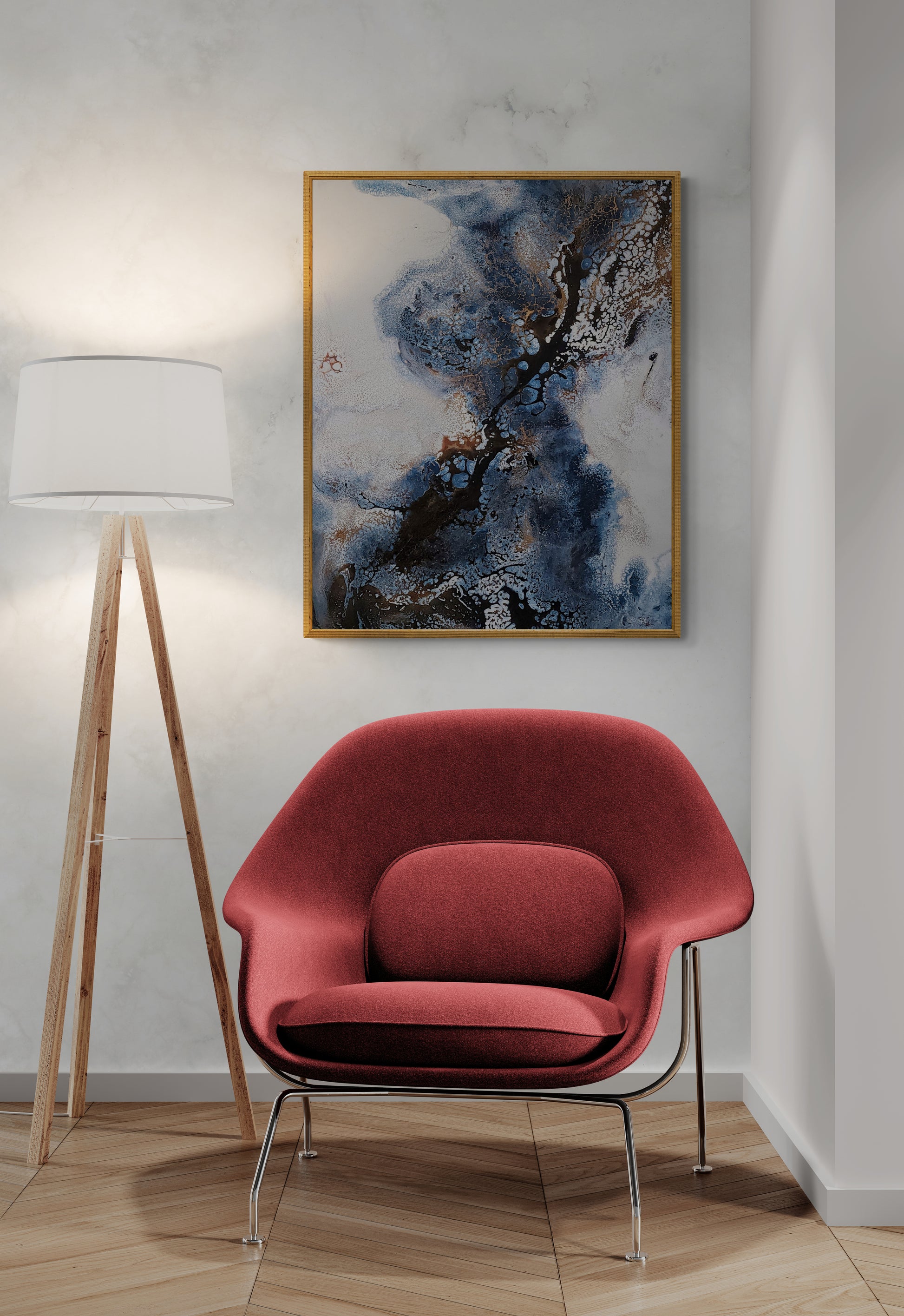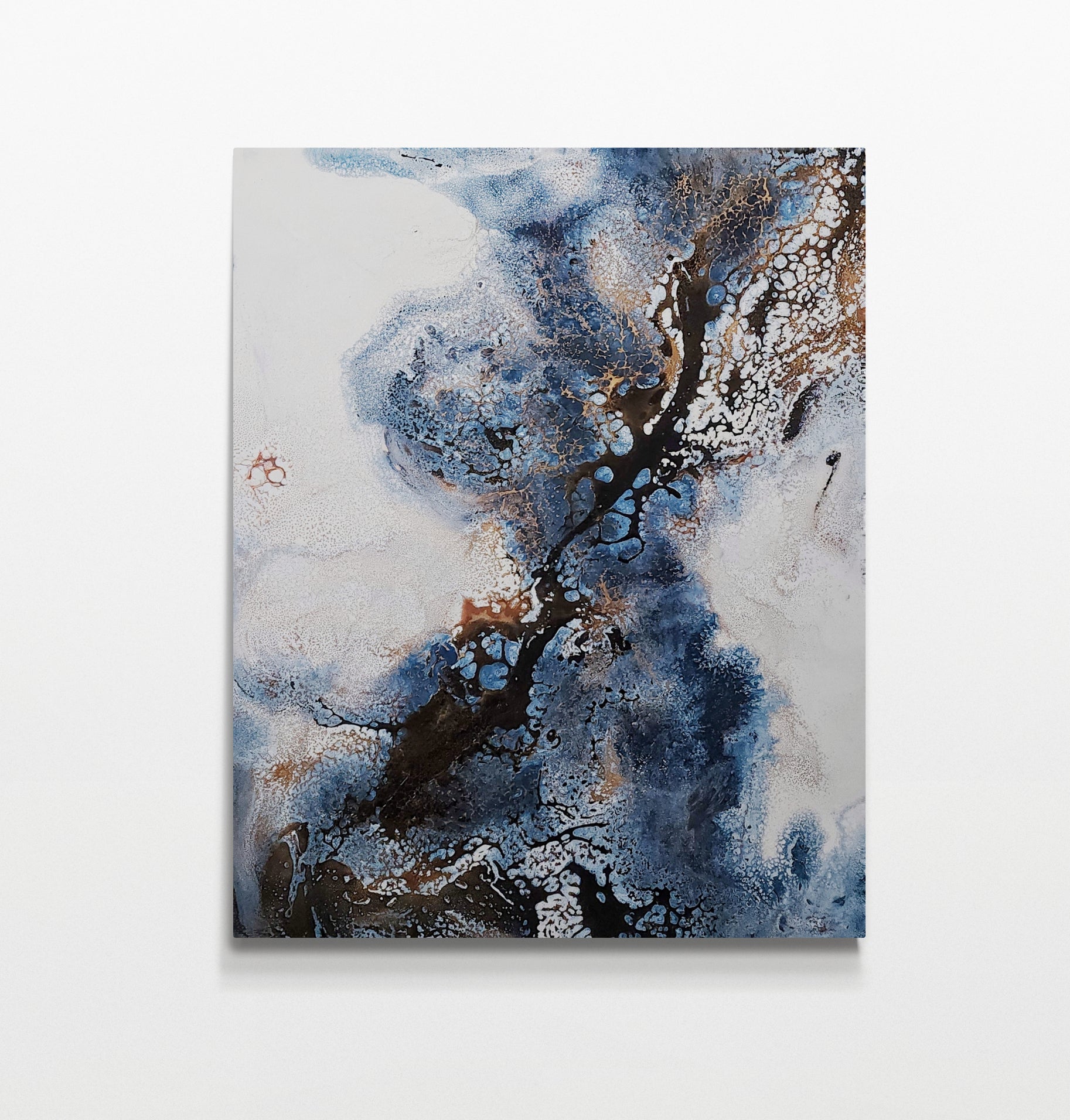 “Blue Rip” combina pinceladas azules profundas con toques dorados, evocando la fluidez del agua y la energía del movimiento en una composición que transmite elegancia y vitalidad.