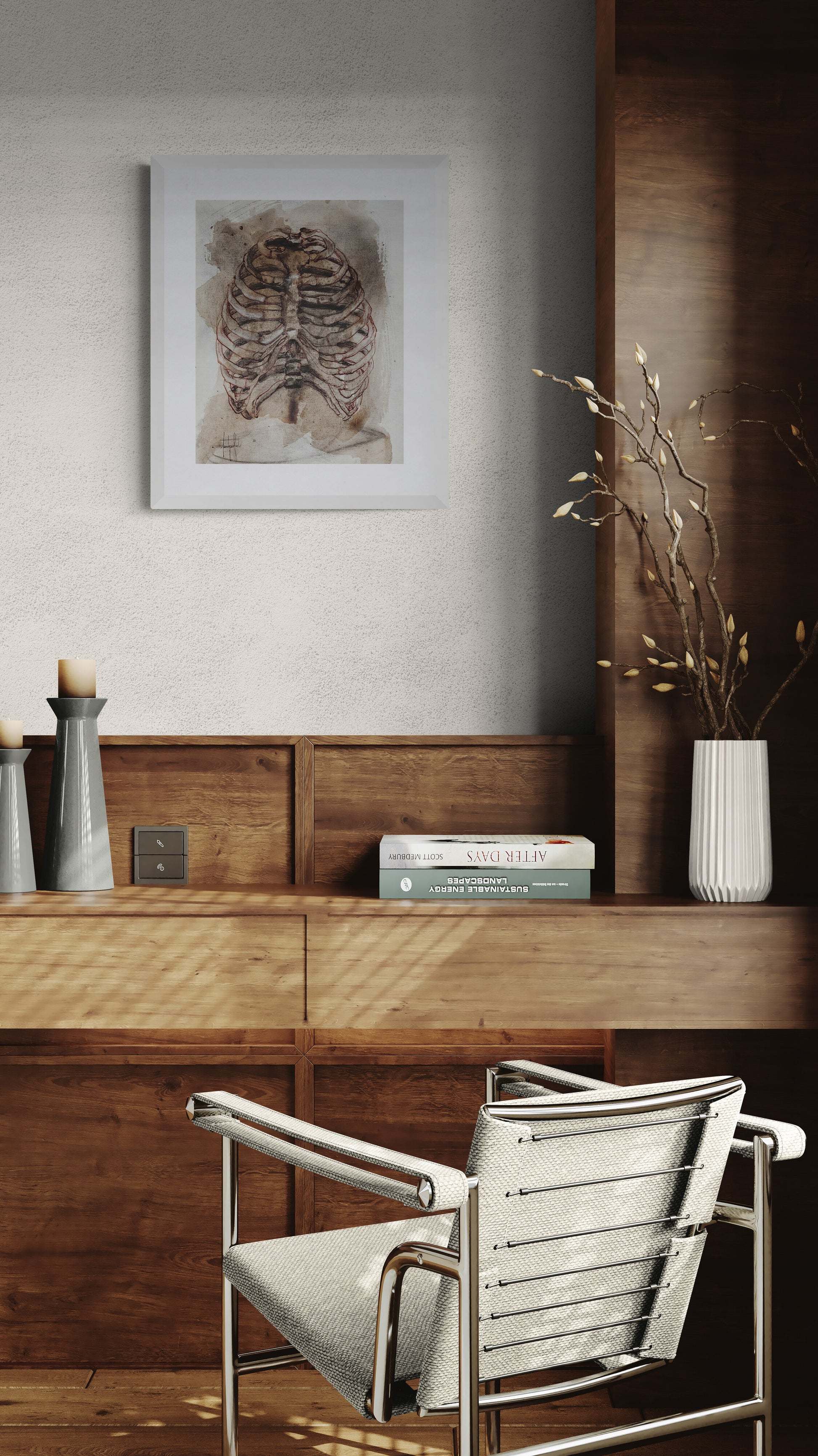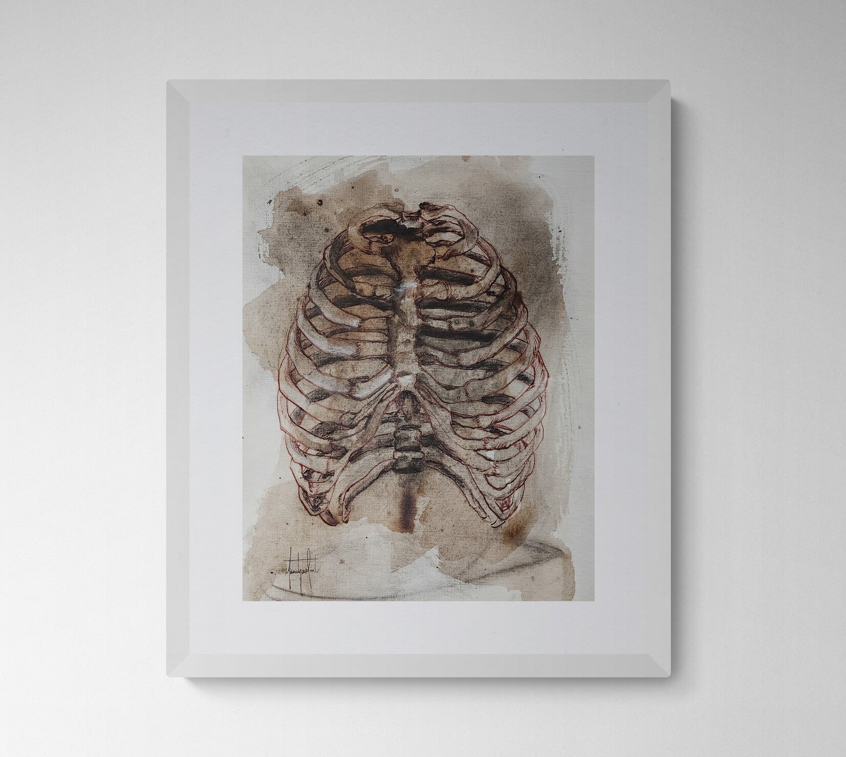 “Caja Torácica” explora la estructura interna del cuerpo humano a través de un estudio detallado de la caja torácica, resaltando la complejidad y fortaleza del esqueleto. Con líneas precisas y una paleta de colores suaves y terracota, la obra transmite la delicadeza de la anatomía humana mientras evoca la fragilidad y la protección que ofrece esta parte del cuerpo. La pieza invita a reflexionar sobre el soporte físico y simbólico que el torso proporciona a la vida misma.