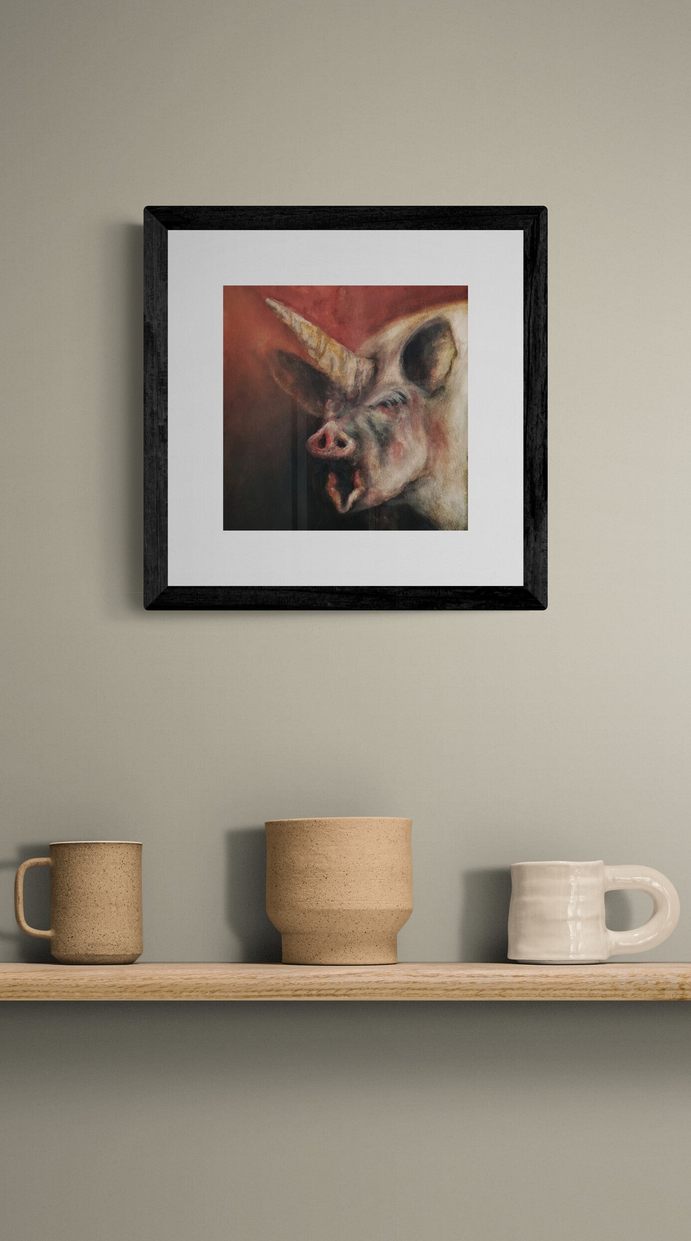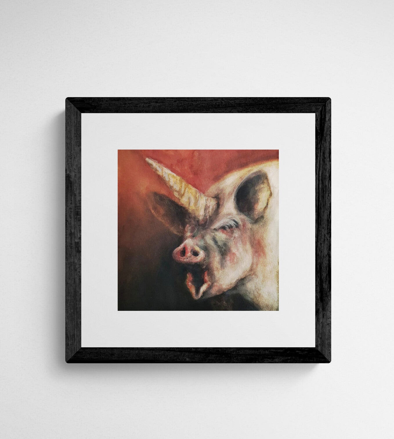 “Cerdicornio enojado” presenta una visión surrealista y provocadora, fusionando la ternura del cerdo con la majestuosidad de un unicornio, creando un contraste extraño y fascinante. La furia reflejada en sus ojos y su cuerno en espiral transforman esta figura en un ser mitológico cargado de simbolismo, invitando a la reflexión sobre la dualidad entre lo animal y lo fantástico.