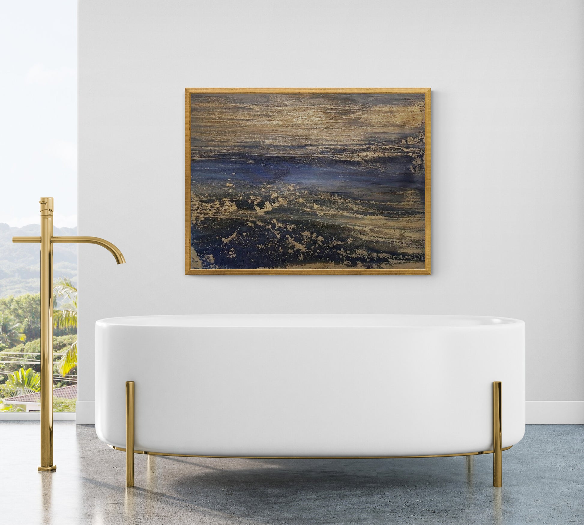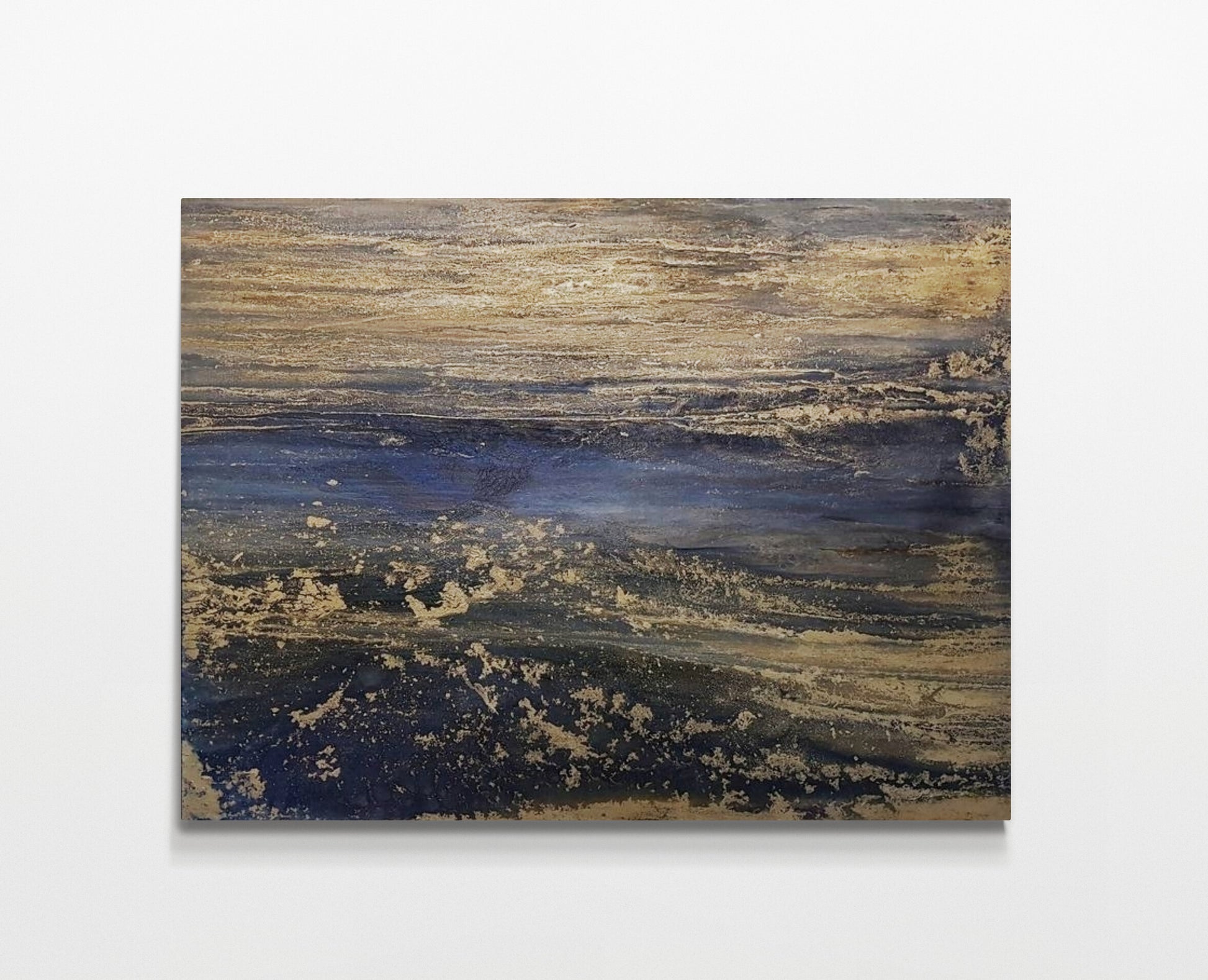 “Composición 24” fusiona profundos tonos azules con dorados relucientes, evocando la elegancia del océano al atardecer y transmitiendo una atmósfera de calma y sofisticación perfecta para espacios modernos.