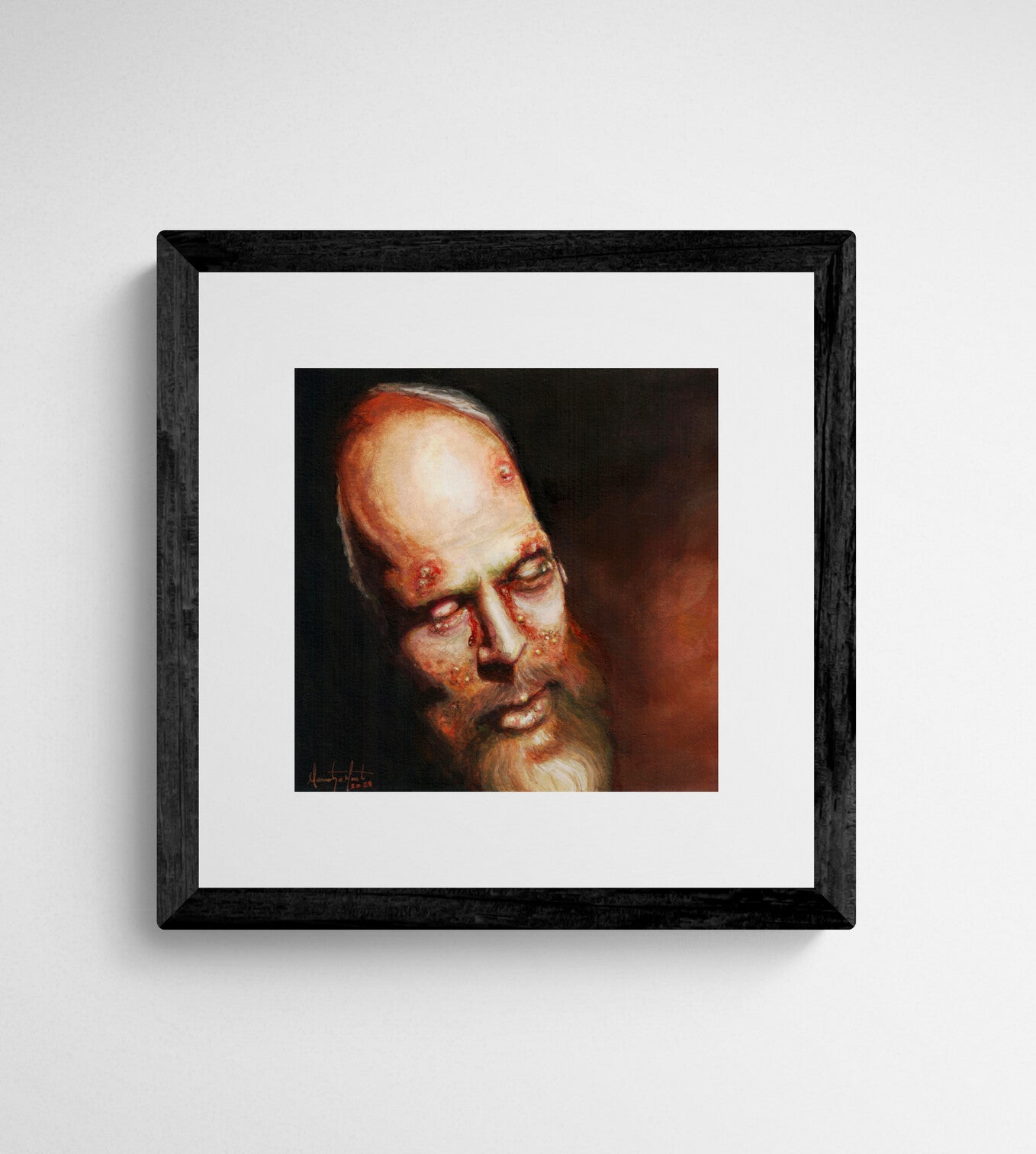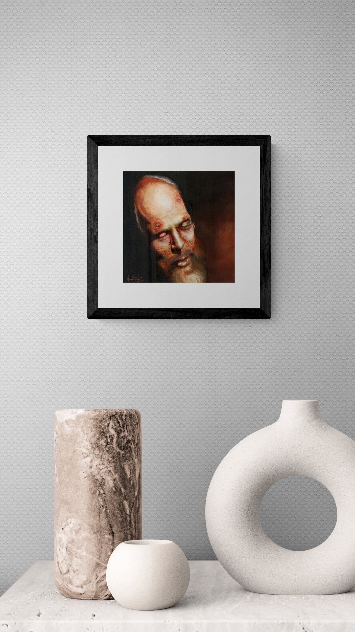 “El alquimista de Malebolge” representa el sufrimiento eterno de un alma condenada en el infierno de Dante, específicamente en la malebolge, el octavo círculo de su Divina Comedia. Aquí, los falsificadores son castigados, y este retrato refleja la agonía de un alma marcada por las cicatrices del engaño y el pecado. Con su rostro demacrado y ojos vacíos, el alquimista transmite la desesperación y la penuria de quienes, por su avaricia y falsedad, enfrentan una condena sin fin. La obra utiliza tonos oscuros y desgarradores para enfatizar la brutalidad de este castigo.
