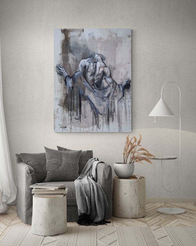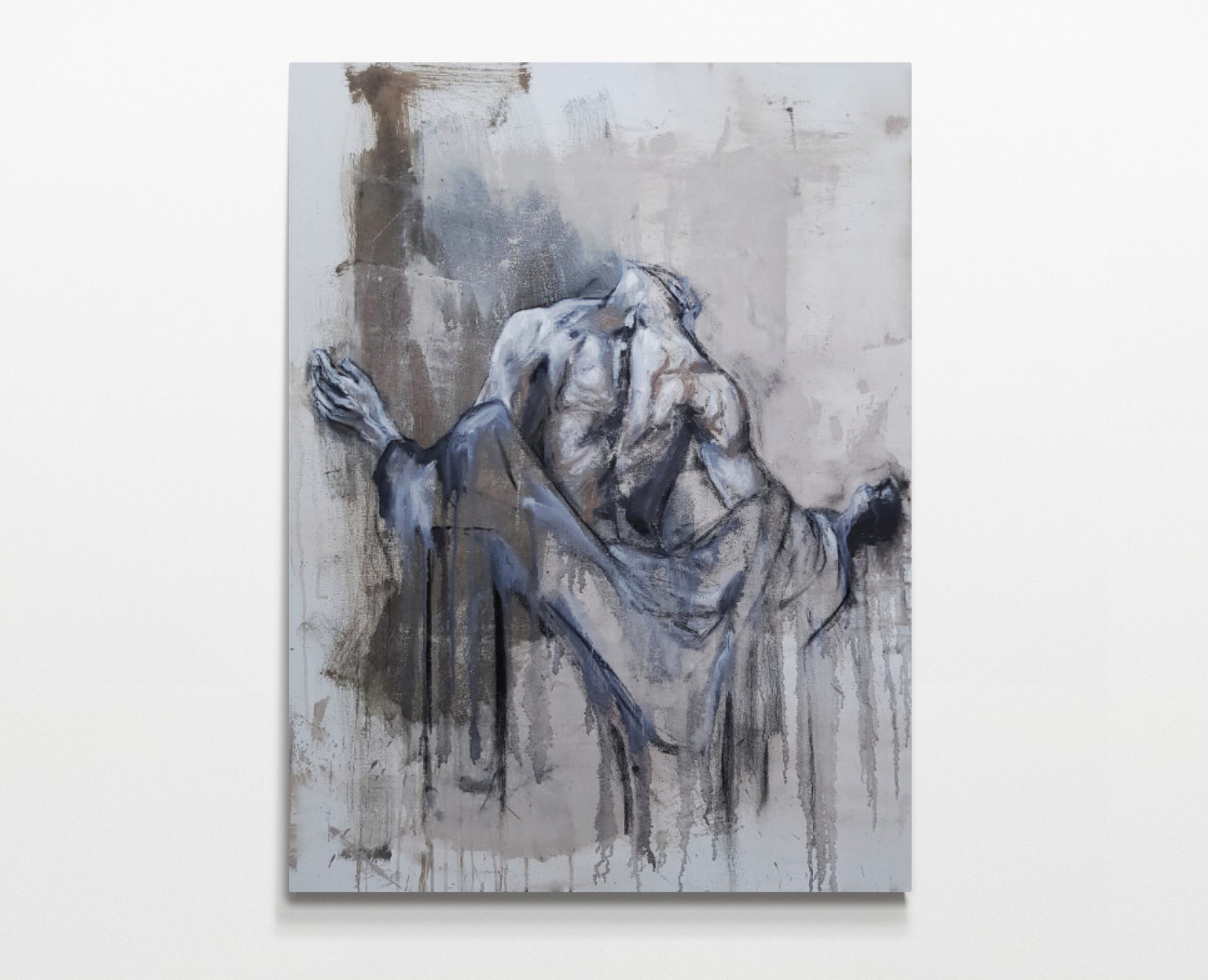 “Nephele” es una obra figurativa de matices grises y azules que evoca la sutileza de la forma humana en un estado introspectivo, logrando una atmósfera de misterio y emotividad a través de trazos difuminados y expresivos.