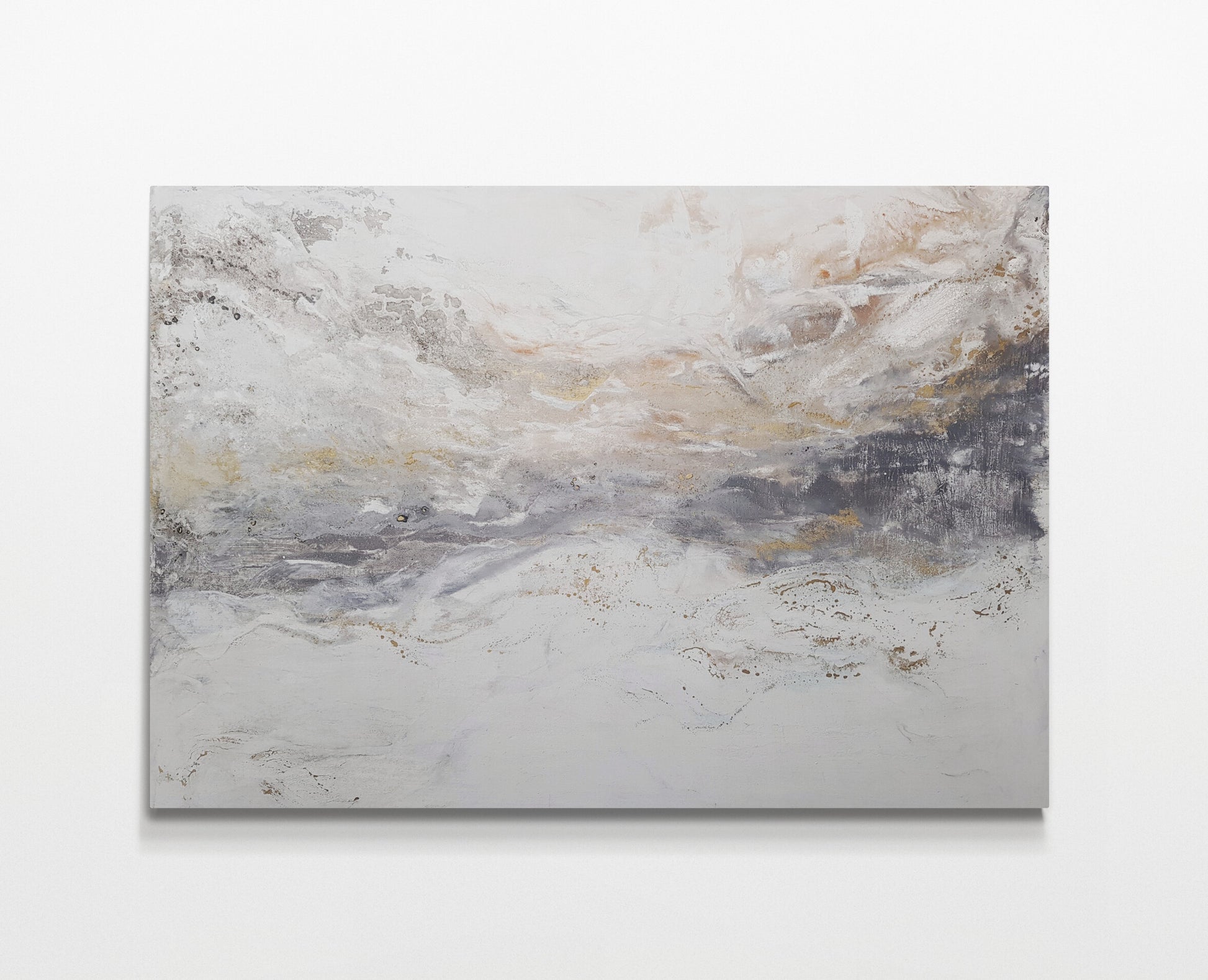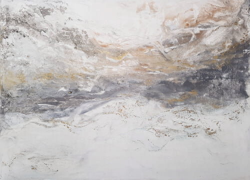 “Tormenta de Arena” fusiona matices blancos, grises y dorados para evocar la fuerza y delicadeza de una tormenta en el desierto. El acabado texturizado y la paleta suave generan un efecto hipnótico que transmite calma y movimiento a la vez.
